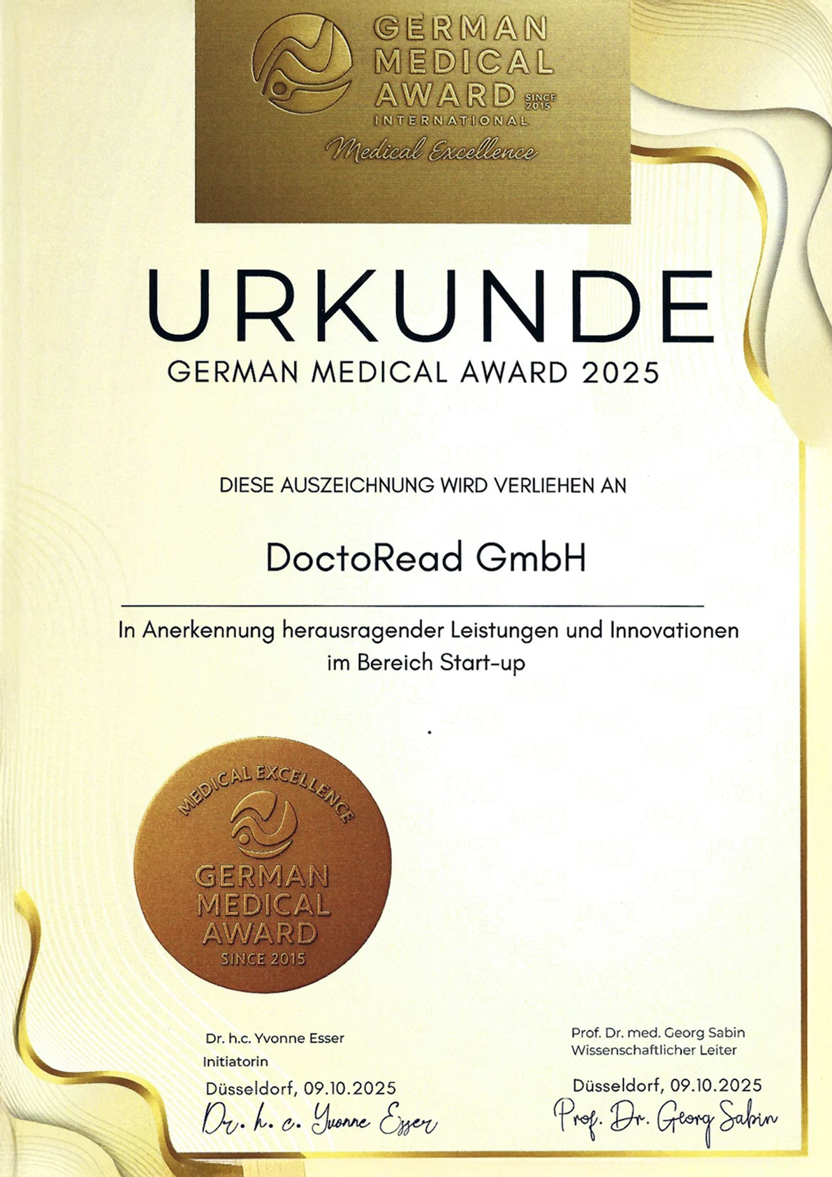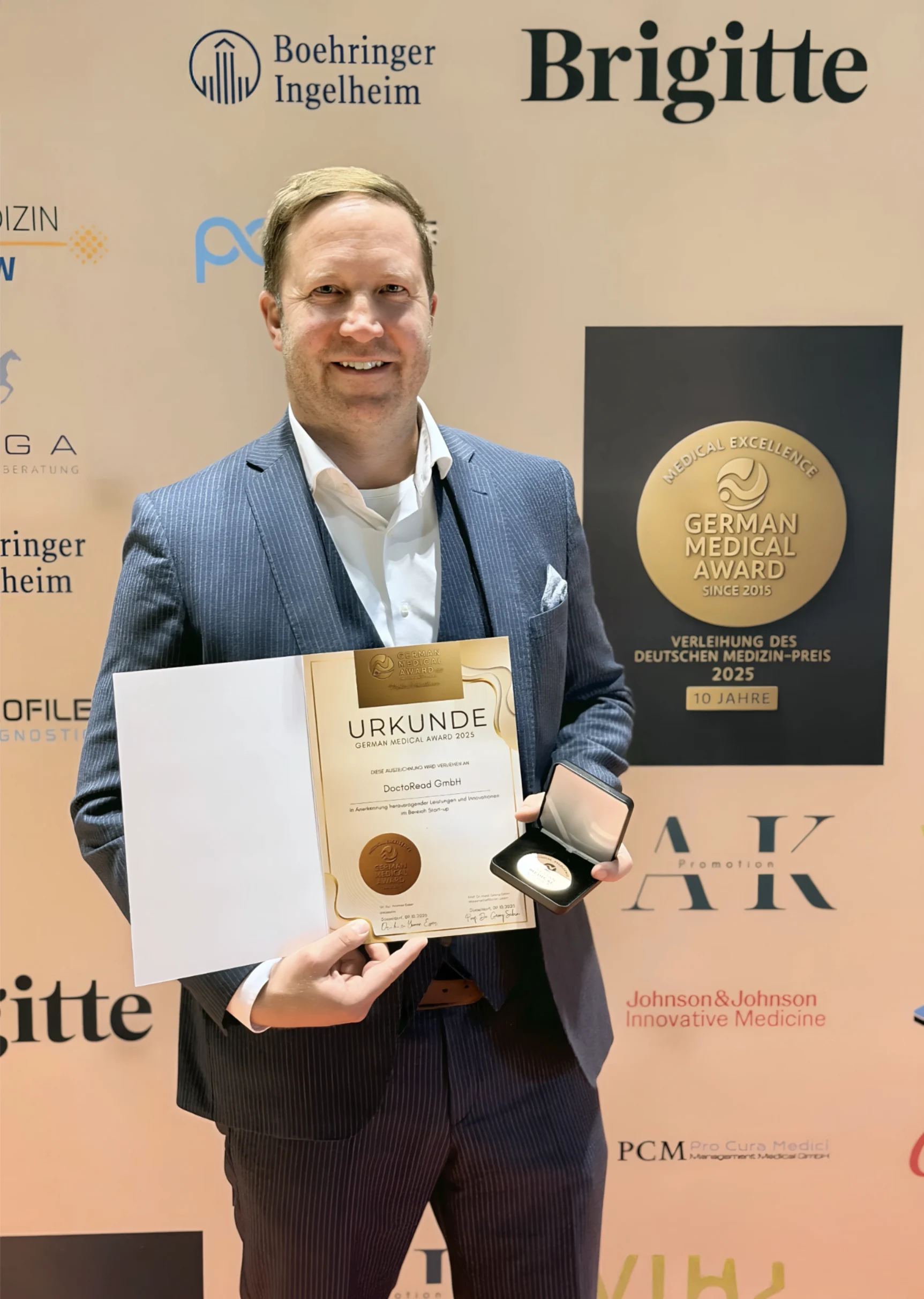 Karl-Josef Laumann, Minister für Arbeit, Gesundheit und Soziales des Landes NRW, gratuliert Geschäftsführer Bastian Hollmann zur Auszeichnung beim German Medical Award.